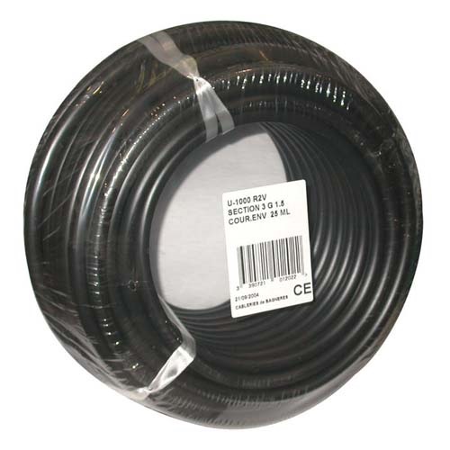 Câble d'installation rigide U-1000 R2V 3G2.5mm² longueur 10 m couronne noir de chez Electraline est un conducteur rigide en cuivre de classe 2. Gaine en PVC. Il peut être installé en conduit apparent ou encastré (moulures, goulottes gaines ou tubes). Apllication : Possédant une âme semi-souple, ils sont principalement destinés au câblage de tableaux. Ils assurent un meilleur contact électrique sous le serrage des bornes et présentent une moindre fragilité mécanique aux vibrations que les conducteurs massifs H07 V-U. U-1000 R2V est un câble rigide, conçu pour les installations fixes, en intérieur ou extérieur (même enterré avec gaine).
