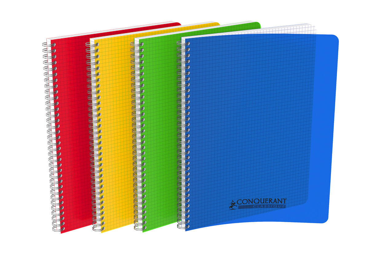 COUVERTURE : La couverture est en polypro lisse et translucide. Elle assure un cahier souple et robuste, qui résistera aux rayures, aux éclaboussures et aux déchirures. RELIURE : La reliure double spirale (aussi appelée reliure intégrale) est résistante et permet une ouverture du cahier à 360°, pour un maximum de flexibilité et de confort pendant l'utilisation. REGLURE : La réglure à petits carreaux 5mm, aussi appelée réglure quadrillée assure une prise de notes structurée. Ce produit est disponible sous les versions de couleurs suivantes : Assorti : Rouge ; Vert ; Jaune ; Bleu