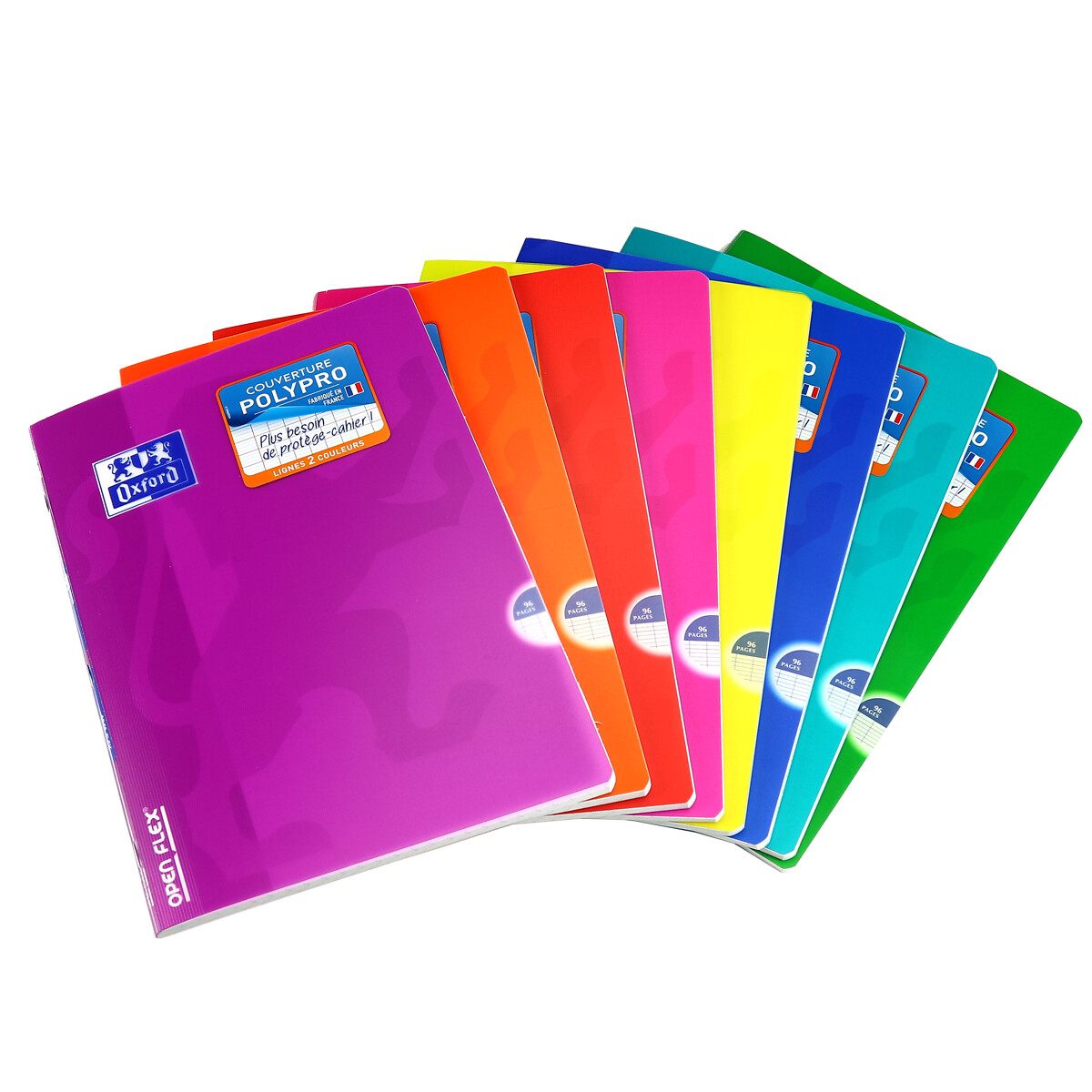 COUVERTURE : La couverture est en polypro lisse et translucide. Elle assure un cahier souple et robuste, qui résistera aux rayures, aux éclaboussures et aux déchirures. Plus besoin de protège-cahier. TECHNOLOGIE : OpenFlex, c'est un brevet de fabrication exclusif. Le dos des couvertures en polypropylène reste souple et confortable et offre ainsi une ouverture optimale à 180°. PAGE DE GARDE : Une page de garde blanche est située derrière la couverture translucide et cache la réglure Seyès. Elle permet aussi d'identifier son cahier en écrivant la matière. Ce produit est disponible sous les versions de couleurs suivantes : - Assorti : Bleu ; Vert ; Rouge ; Jaune ; Violet ; Orange ; Rose ; Bleu Ciel - Bleu - Jaune - Rouge - Vert