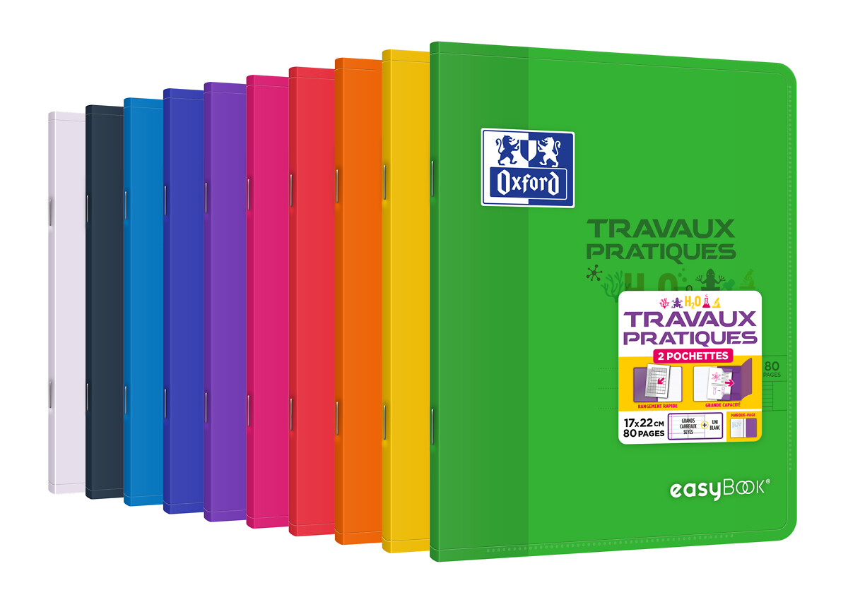 COUVERTURE : Plus besoin de protège-cahier avec easyBook ! La couverture plastique est ultra-résistante et imperméable.-RANGEMENT : Une pochette 3 rabats à grande capacité est située à l’arrière du cahier. Elle permet de stocker et de transporter tous ses polycopiés et autres documents. ORGANISATION : Une pochette plastique est intégrée à l’avant du cahier pour ranger temporairement des documents importants ou customiser sa couverture. Un rabat marque-page, situé en fin de cahier, permet de retrouver ses notes rapidement et les protéger.-PAGE DE GARDE & RABAT : Une page de garde blanche est située derrière la couverture translucide et cache la réglure Seyès. Elle permet aussi d'identifier son cahier en écrivant la matière.-REGLURE : La réglure à grands Carreaux Seyès, en 2 couleurs assure une meilleure lisibilité. Elle permet de réduire l'effet de la fatigue visuelle, tout en améliorant efficacement la concentration. COMPATIBLE SCRIBZEE : Pour vous aider à vous retrouver dans vos notes, dans votre organisation et dans votre classement, OXFORD a conçu SCRIBZEE : une application gratuite et innovante pour scanner, sauvegarder et organiser ses notes.