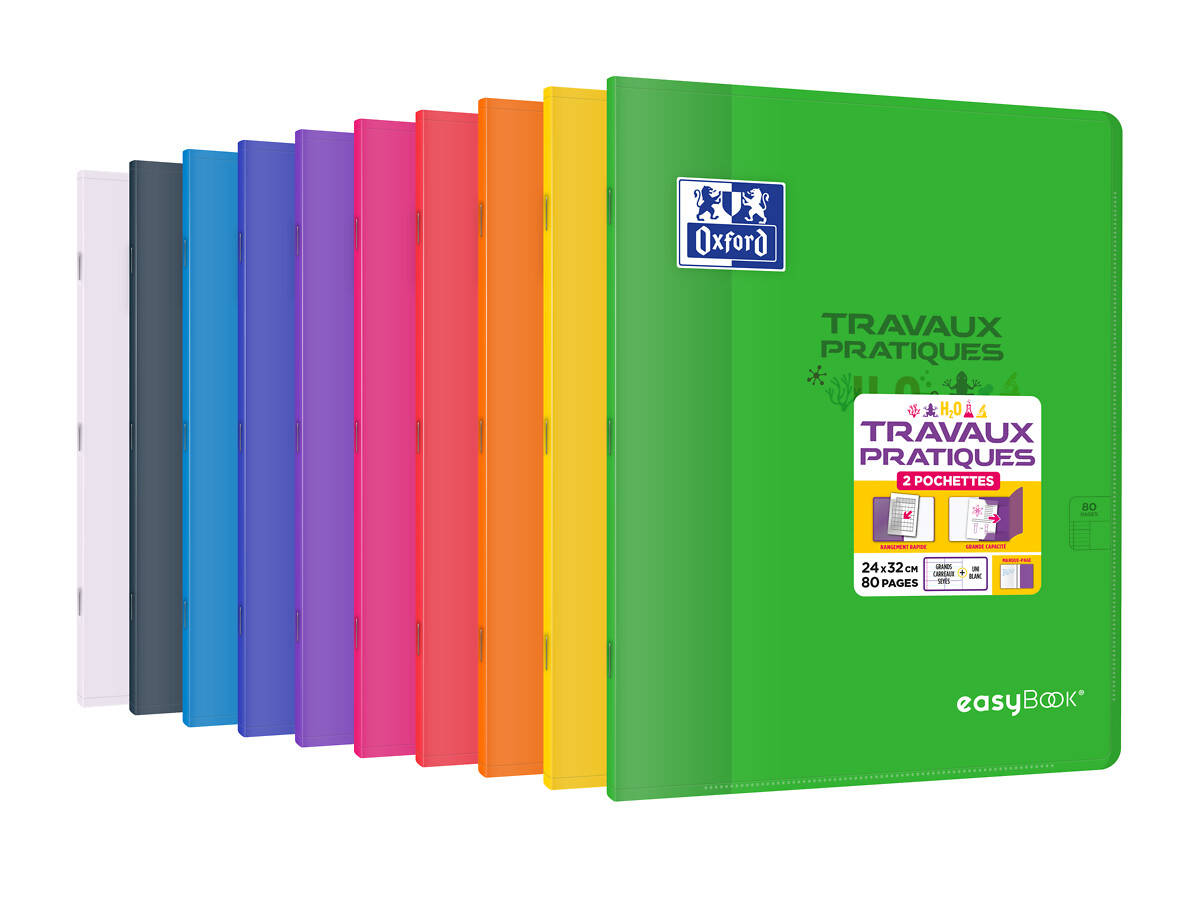 COUVERTURE : Plus besoin de protège-cahier avec easyBook ! La couverture plastique est ultra-résistante et imperméable.-RANGEMENT : Une pochette 3 rabats à grande capacité est située à l’arrière du cahier. Elle permet de stocker et de transporter tous ses polycopiés et autres documents. ORGANISATION : Une pochette plastique est intégrée à l’avant du cahier pour ranger temporairement des documents importants ou customiser sa couverture. Un rabat marque-page, situé en fin de cahier, permet de retrouver ses notes rapidement et les protéger.-PAGE DE GARDE & RABAT : Une page de garde blanche est située derrière la couverture translucide et cache la réglure Seyès. Elle permet aussi d'identifier son cahier en écrivant la matière.-REGLURE : La réglure à grands Carreaux Seyès, en 2 couleurs assure une meilleure lisibilité. Elle permet de réduire l'effet de la fatigue visuelle, tout en améliorant efficacement la concentration. COMPATIBLE SCRIBZEE : Pour vous aider à vous retrouver dans vos notes, dans votre organisation et dans votre classement, OXFORD a conçu SCRIBZEE : une application gratuite et innovante pour scanner, sauvegarder et organiser ses notes.