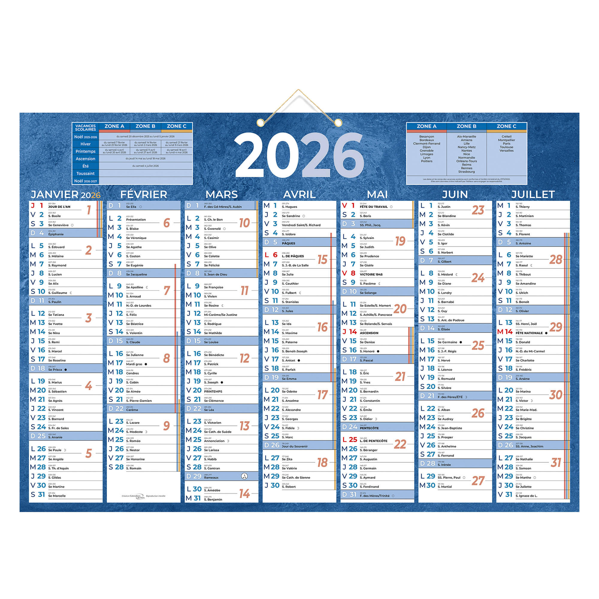 Calendrier classique présentant 7 mois par face. 2 tableaux récapitulatifs des périodes de vacances scolaires et de la répartition des zones géographiques A, B et C.