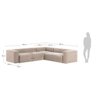 Canapé d'angle 5 places. Revêtement en tissu, non déhoussable. Conçu pour un usage domestique intensif, très haute résistance à l’usure (Martindale > 90 000). Structure en MDF E0, bois de pin et panneau de particules E0. Mousse haute densité : assise 28 kg/m³, dossier et accoudoirs 20 kg/m³. Charge maximale : 500 kg. Résistance UV niveau 5. Système de montage simple avec outil fourni. Dimensions H 69 x L 320 x P 290 cm. Coloris beige.