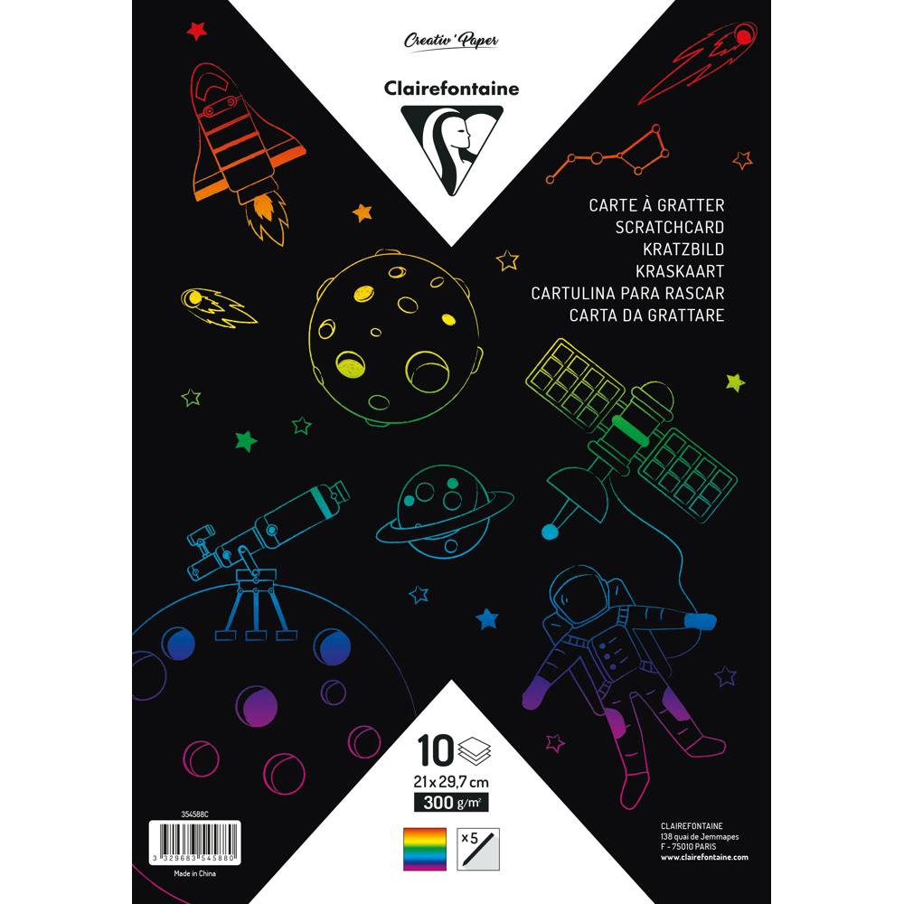 Technique simple permettant de découvrir progressivement les magnifiques couleurs de l'arc-en-ciel qui se cachent sous le revêtement des cartes en les grattant avec un bâtonnet en bois. Idéal pour faire des gribouillis, prendre des notes, dessiner, écrire ou pour tous autres projets créatifs. Ce sachet contient 10 feuilles de carte à gratter 300g/m2 au format A4 (21x29,7cm) + 5 batonnets en bois.
