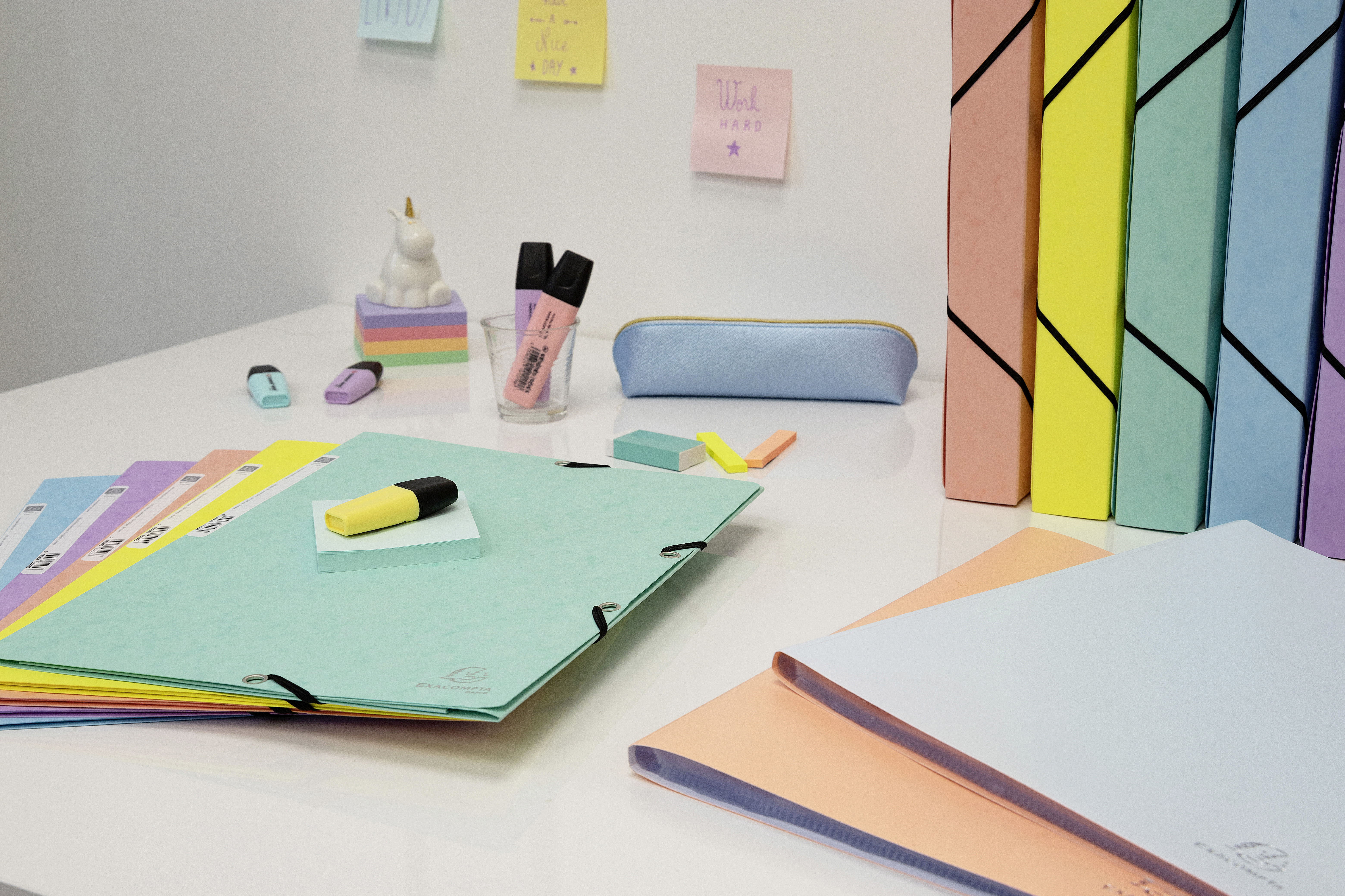 Disponible en 5 couleurs assorties pastel : corail, bleu pastel, vert pastel, jaune citron et mauve. Format : L 24 x H 32 cm. Dos : 3 cm.