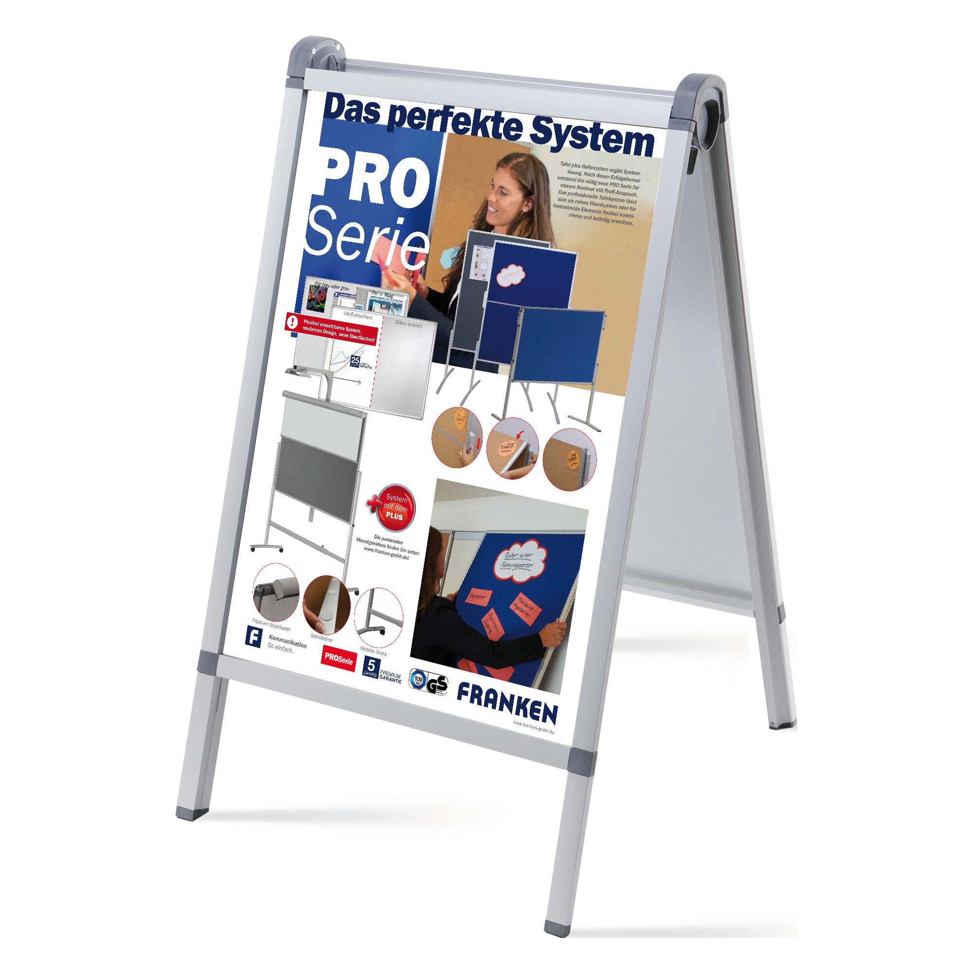 Affichez vos publicités et vos informations diverses grâce au chevalet stop trottoir sur pieds de Franken. Vous pouvez l’utiliser pour l’affichage d’un poster A1 (84,1 x 59,4 cm) sur chacune de ses deux faces. Le changement du contenu se fait simplement et rapidement.