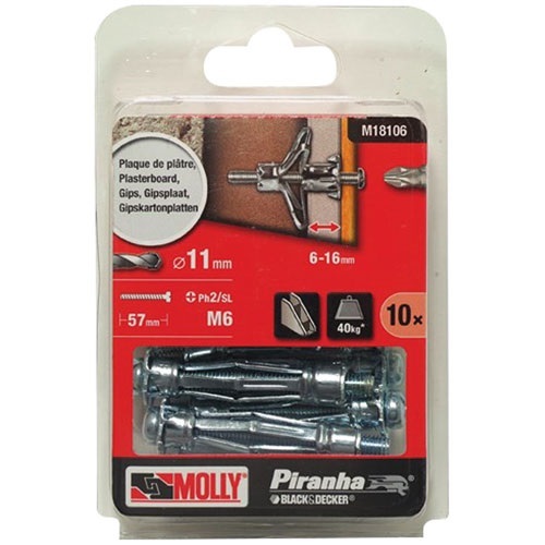 La cheville métallique à expension diamètre 6 millimètres longueur 50 millimètres avec vis métrique à tête cylindrique lot de 10 de la marque Molly s'utilise dans la brique creuse, cloison de doublage, contre-cloisons, plaque de plâtre. Pour fixer des objets suspendus. Pour porte : porte-manteau, patère, armoire électrique, chemin de cable, thermostat, convecteur... . Ecrou parfaitement cylindrique : ancre solidement l'écrou au corps de la cheville l'enpêchant de se désolidariser lors du montage. Branches précintrées : expansion facilitée. Traitement anticorrosion longue durée : protège durablement la cheville de la corrosion. Tête large et picots anti-rotation : finition et stabilité parfaites, évite la détérioration des parois. Tête détachable. Large branches en étoile : répartition optimale de l'appui. Charge indicative 40 Kg.