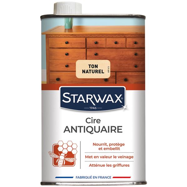 La cire antiquaire liquide ton naturel de 500 mL de la marque STARWAX est une cire d'entretien qui permet de rénover l'aspect de surface, de réchauffer une teinte et de nourrir le bois pour éviter le dessèchement. La cire antiquaire s'utilise en ton sur ton sur un meuble ou une boiserie teinté.