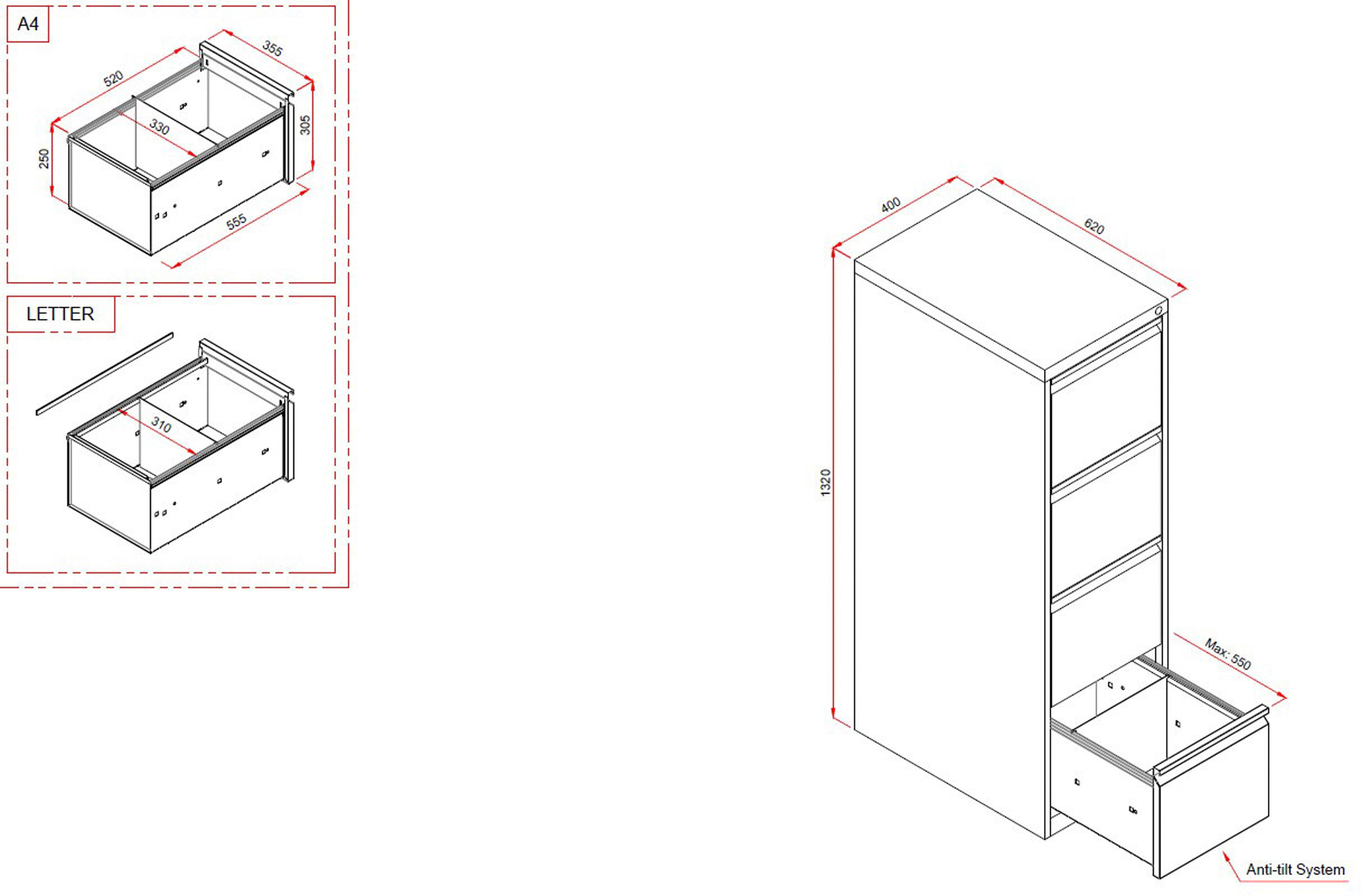 Dimensions utiles des tiroirs pour dossiers suspendus : H 25 x L 33 x P 54 cm.