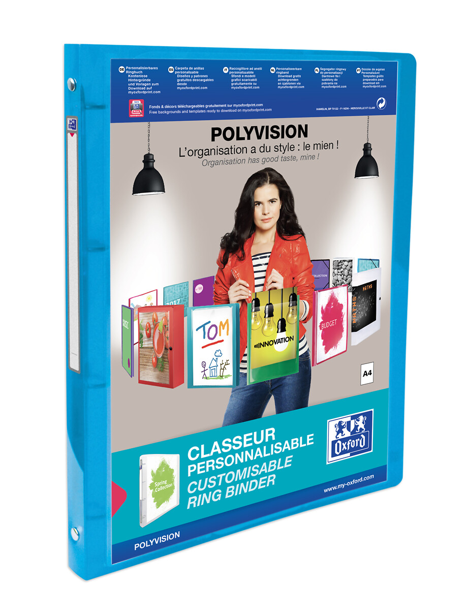 PERSONNALISATION : Le classeur Polyvision est muni d'une poche plastique en 1ère de couverture où l'on peut y insérer une feuille A4 pour identifier et personnaliser son classeur. Plusieurs modèles gratuits de personnalisation de la page de garde sont disponibles sur notre site web. RESISTANCE : La pochette transparente de personnalisation, située sur la 1ère de couverture, est très résistante car elle est dotée d'une encoche anti déchirure. COUVERTURE : La couverture est en polypro translucide lisse. Elle assure un classeur résistant aux traces. La transparence de la couverture permet d'identifier rapidement le contenu du classeur. Ce produit est disponible sous les versions de couleurs suivantes : - Assorti : Incolore, Bleu, Rouge, Violet, Vert - Bleu - Incolore