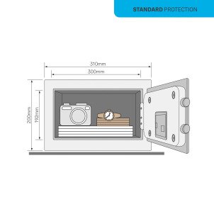 Serrure électronique programmable de 3 à 8 chiffres. En cas de tentative d'effraction ou de la saisie de 3 codes erronés, l'alarme de 130 dB se déclenche. Elle s'interrompt après 1 minute si elle n'est pas arrêtée en entrant le code correct ou en ouvrant avec la clé de secours. Lors de l’ouverture, les pênes de 16 mm se rétractent du coffre en actionnant la poignée.