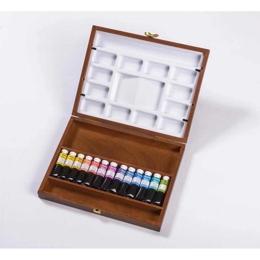 Coffret en bois d'acajou, selection d'aquarelles tubes. Les aquarelles extra-fines BLOCKX présentent toutes un degré de résistance à la lumière exceptionnel (note de 7/8 sur l'échelle de m esure internationale BWS). Composé de pigments rares, très finement broyés, enrobés de gomme arabique et de miel pour renforcer la résistance dans le temps des couleurs et leur donner d'avantage d'éclat et de luminosité, les aquarelles BLOCKX offrent une brillance et une texture onctueuse.