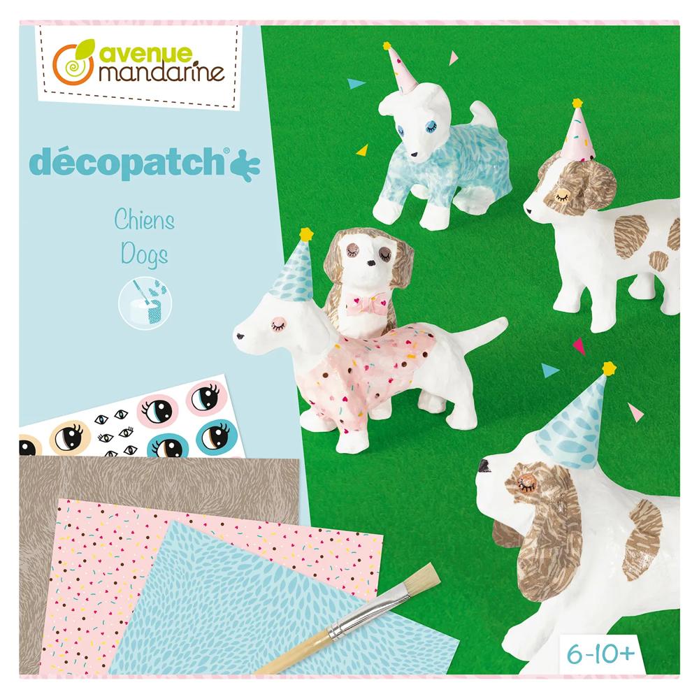 Coffret créatif sur le thème des chiens permettant à chaque enfant (et parent !) de découvrir ou redécouvrir l'univers du collage de papier décoratif - made in Décopatch ! Contenu : 5 chiens en papier mâché - 4 feuilles Décopatch - 1 pinceau - 1 pot de colle - 1 notice Conforme aux normes CE. A partir de 6 ans.