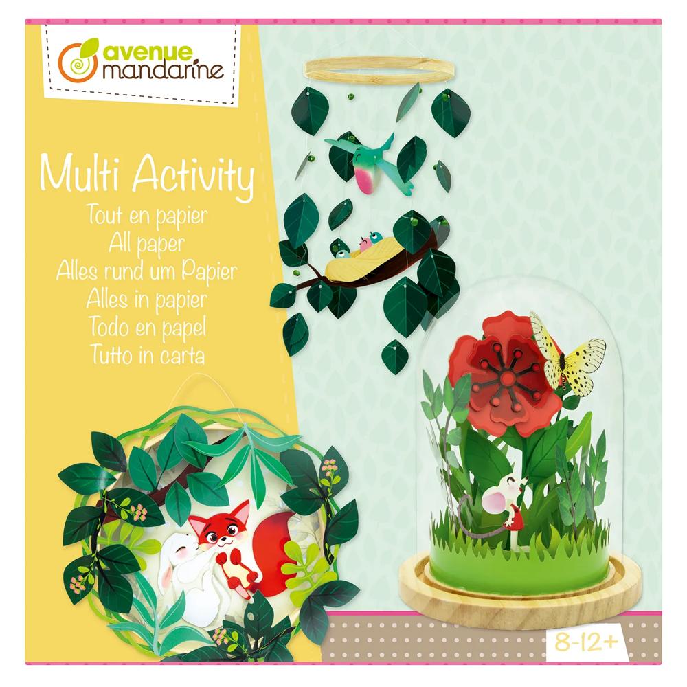Découvrez ce coffret proposant 3 activités autour du papier : un tableau 3D, un mobile et un globe décoratif à réaliser. Tableau 3D : 3 planches d'éléments prédécoupés en papier, un cercle en bois, un crochet, un tube de colle. Mobile : une planche d'éléments prédécoupés en papier, un cercle en bois, fil nylon, perles en bois. Globe décoratif : une planche d'éléments prédécoupés en papier, un globe en plastique avec support en bois.