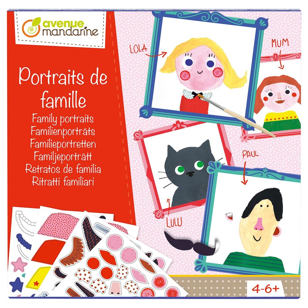Dessiner sa famille ! Ses parents, ses frères et soeurs, son animal de compagnie... Dans ce coffret créatif, chaque enfant pourra dessiner des portraits sur de grands cadres et compléter ses dessins grâce aux 3 planches de stickers ou d'éléments pré-découpés présents dans ce coffret. Contenu : 5 cadres en carton 25x25 cm, 3 planches A5 de stickers, 3 planches A5 d'éléments pré-découpés en carton, 18 pots de peinture, 2 pinceaux, 50 carrés de mousse adhésifs double-face 10x10 cm, notice. Conforme aux normes CE - A partir de 4 ans.