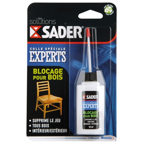 Colle Blocage pour bois SADER, conçue pour supprimer le jeu dans tous les assemblages de pièces en bois. Sa formule liquide concentrée dilate les fibres de bois et les fait gonfler jusqu'au blocage maximum. Applicateur précis. Résiste aux variations de température. Quantité : 50 mL. Pratique pour les meubles en kit, les pieds et dossiers de chaises, les manches de balais et d'outils, les chevilles en bois, les cadres.