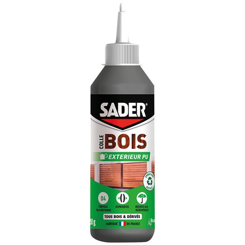 Colle bois extérieur SADER, colle polyuréthane (PU) mono-composante, pour tous les travaux d'assemblage et de réparation des bois en extérieur. Excellente résistance à la chaleur et à l'humidité. Biberon de 250 g. Elle convient à tous les types de bois mêmes exotiques et leurs dérivés et elle adhère sur tous supports (béton, caoutchouc, plâtre).
