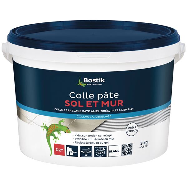 La colle carrelage en pâte améliorée de 3 Kg de couleur blanche de la marque Bostik est prête à l'emploi pour les murs intérieurs et extérieurs et sols intérieurs, résiste à l'eau et au gel. Pour tous carrelages standards jusqu'à 40 x 40 cm : grès (cérame ou étiré), faience, marbre naturel (effectuer des tests de non tachabilité),pate de verre, pierre, terre cuite, dalles de pierres calcaires. Poids maximal du carrelage : au mur : < 30 kg / m². Pour les supports neufs : mortier, béton, ciment, plâtre et plaques de plâtre cartonné, panneaux de bois CTBH / CTBX / OSB3 *, dallage sur terre plein. Pour les supports anciens "rigides" au mur : carrelage poncé, béton cellulaire / au sol : ragréage P3. Pour les supports anciens "déformables" au mur : peinture poncée /au sol : chape allégée. Le support doit être propre, sec, non poussiéreux, exempt de graisses et de zones non adhérentes. Appliquer la colle sur le support par surface de 1 à 2 m² à l'aide d'une spatule adaptée au format du carrelage. Une fois la colle appliquée sur le support, il reste 20 minutes environ pour poser le carrelage. Poser les carreaux sur les sillons de colle fraîche puis exercer une pression forte sur toute sa surface afin d'obtenir un bon transfert. Temps d'ajustement du carrelage : 30 minutes environ. Température d'application comprise entre +5°C et +30°C. Conservation de 18 mois à partir de la date de fabrication : en emballage d'origine, fermé et entreposé au sec, à l'abri du gel et des fortes chaleurs.