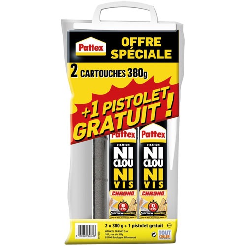 La colle fixation ni clou ni vis Colle de 310 mL en Lot de 2 et avec un pistolet de la marque PATTEX, est parfaite pour tous vos collages du quotidien. Multi-matériaux : bois, carrelage, métal, pierre, plastique, plâtre, béton. Fixation surpuissante, 65 Kg au cm². Maintien immédiat en 10 secondes. Ne coule pas. Peut être peint. Sans solvant. Utilisable en intérieur et en extérieur abrité. Idéal pour ceux qui possèdent un pistolet à mastic et qui réalise régulièrement des travaux. Selon le travail, vous coupez la canule au diamètre souhaité.