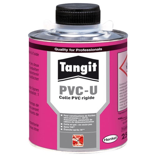 La colle pour tubes et raccords en PVC 250 g de la marque TANGIT convient pour l'assemblage des canalisations en PVC rigide. Cette colle ne peut pas être utilisée pour les tubes et raccords en contact avec de l'eau potable. Cette colle gel répond aux attentes et aux besoins des professionnels comme des particuliers. Testée jusqu'à 51 bars, elle offre une haute résistance à la pression. Bien lire les conseils d'utilisation avant emploi. Colle en gel pour tubes et raccords en PVC rigide. Composition : chlorure de polyvinyle non plastifié, solvants forts. Texture : gel. Ne coule pas. Non adaptée pour tubes et raccords d'eau potable. Convient pour la distribution de l'eau jusqu'à + 60 °C Certification CSTB n° 03AD04 Sans THF.