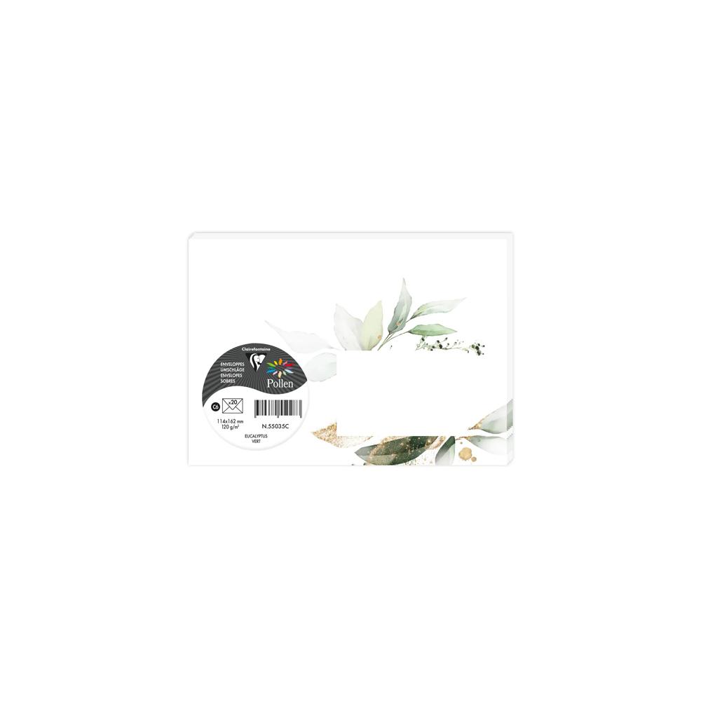 Une collection d'enveloppes imprimées dont le savant mélange de fraîcheur et de délicatesse est distillé par des branches d'eucalyptus. A la douceur des tonalités de l'eucalyptus s'ajoute un effet aquarelle pour une correspondance élégante et raffinée. Ce paquet contient 20 enveloppes imprimées 120g/m2 au format C6 (11,4x16 ,2cm). Le papier est certifié FSC, sans acide et compatible pour l'écriture, l'impression jet d'encre et laser. Fabrication Française dans nos ateliers à Etival-Clairefontaine dans les Vosges, avec un savoir-faire depuis 1880.