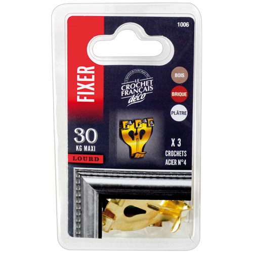 Le crochet acier N°4 avec aiguilles lot de 3 de chez Le Crochet Français permet de fixer aisément tableaux et cadres légers. Des crochets en acier, des pointes en acier trempé pour les fixer : une résistance optimum qui convient parfaitement aux supports tels que le bois, les plaques ou carreaux de plâtre, béton cellulaire et les briques creuses. Les plus produit n'abime pas les murs. Trou de la pointe très discret. Facile à repositionner. Dimensions : l 3,8 x P 4,4 x H 2,0 cm. Idéal pour bois, plaques de plâtre, carreaux de plâtre, béton cellulaire, briques creuses. Résistance maxi 30 Kg. Mise en œuvre, marteau. Temps de pose 1 minute(s). Finition, acier laitonné.