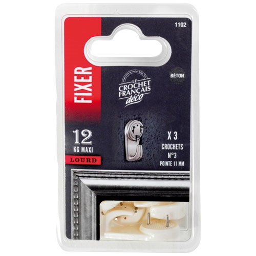 Le crochet béton N°3 Suédois pointes 11 mm lot de 3 de chez Le Crochet Français permet de fixer aisément tableaux et cadres lourds. Des pointes en acier au carbone trempé pour une résistance optimum sur les supports béton. Les plus produit, pointes 11mm haute résistance. Les conseils du pro : Sur des murs en béton très durs ou très denses il peut arriver que les pointes soient difficiles à enfoncer en totalité. En cas de forte résistance, il peut arriver que le béton éclate en surface, le crochet ne tient plus et le mur est dégradé. Le conseil : s'il ne reste que 1 ou 2 mm de pointes qui ne s'enfoncent plus (mais pas plus de 1 ou 2mm), l'expérience montre que le crochet tient parfaitement bien. Il ne faut plus insister et arrêter d'essayer d'enfoncer le reste des pointes. La conjugaison des pointes en acier trempé, et l'élasticité mécanique du béton feront que les pointes seront suffisamment tenues par le béton. Dimensions : l 2,0 x P 1,3 x H 4,0 cm. Idéal pour tous supports béton : béton vibré, parpaings, ... Résistance Maxi 12 Kg. Mise en œuvre, marteau. Temps de pose 1 minute(s). Finition PVC.