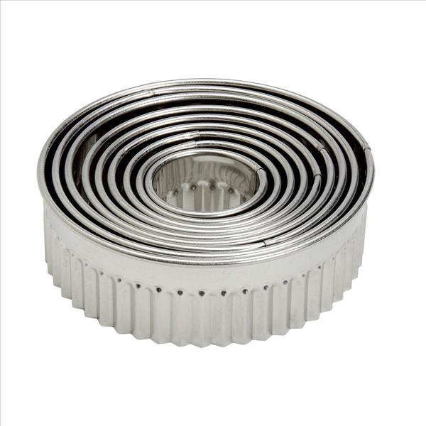 Description détailléeDécoupoir rond cannelé de 9 emporte pièces Inox - Les différents diamètres sont 4 , 5 , 6 ,7 ,8 , 9 , 10 , 11 et 12 cm .