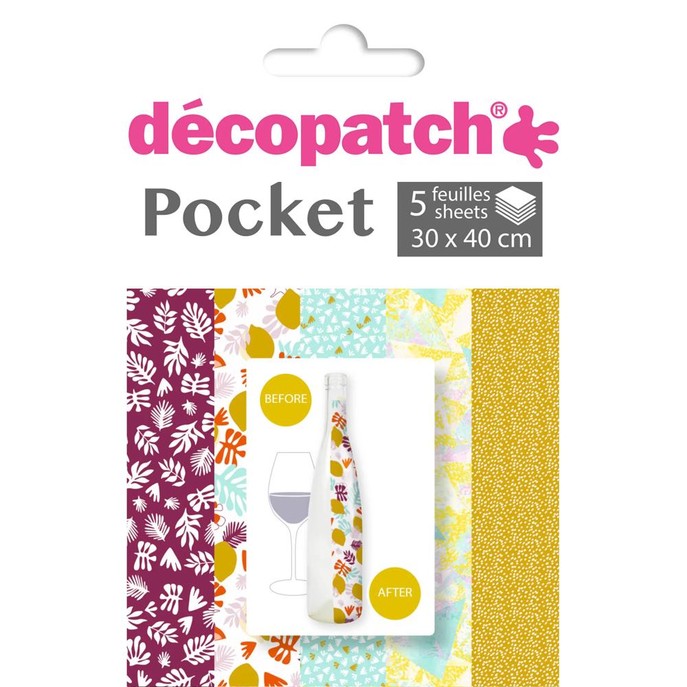 Les feuilles Décopatch vous permettront de décorer et de personnaliser de multiples supports (carton, polystyrène, bois, métal, poterie...) à l'aide du vernis colle Décopatch (non fourni). Une façon écologique de redonner vie aux vieux objets (meubles, articles chinés ou détournés de leur utilisation d'origine...). Plus de gâchis ! La mode est au reçyclage. Pour cela, rien de plus facile : déchirez ou découpez quelques morceaux de papier Décopatch d'environ 2x2 cm - Appliquez la colle sur le support que vous avez choisi. Déposez un morceau de papier sur la surface encollée et mettre une deuxième couche de colle dessus. Superposez les morceaux de papier pour recouvrir le support en mixant les couleurs et les motifs facilement grâce à cette petite pochette de 5 motifs assortis. Feuilles 30x40 cm - S'applique sur surfaces planes ou irrégulières - 5 motifs assortis.