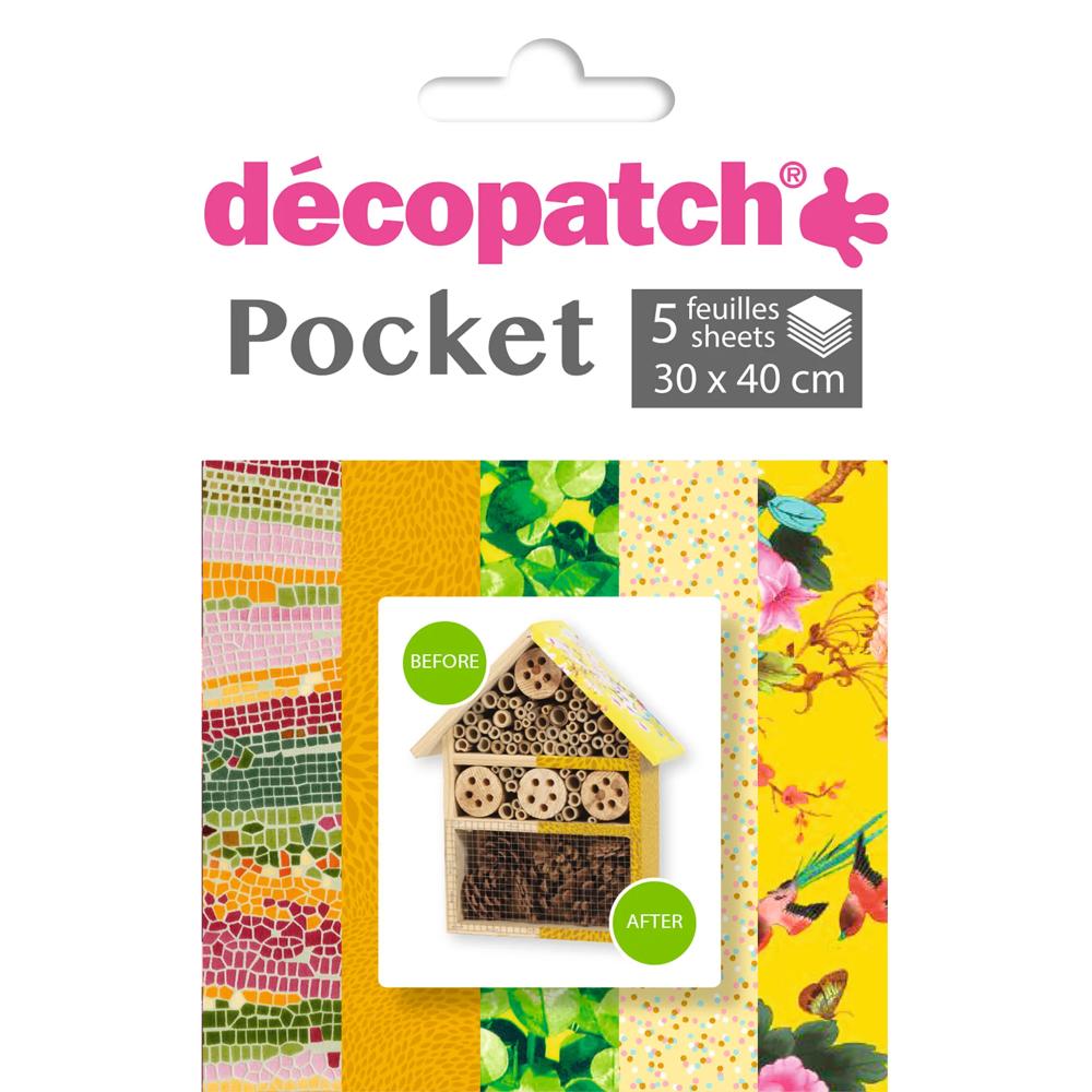 PAPIER MULTI-SURFACES : Le papier Décopatch épouse parfaitement la forme de tous les objets (planes ou irrégulières) et sur toutes les matières (papier mâché, bois, plastique, fer, verre, polystyrène, métal, terre cuite, céramique, liège...). FINITION PARFAITE : Très facile à appliquer grâce à sa finesse et à sa résistance une fois encollé, le papier Décopatch est l'unique papier à donner un aspect lisse et l'illusion d'une peinture à vos réalisations ! ECOLOGIQUE : Décopatch vous permet de redonner vie à un vieux meuble, moderniser des trésors chinés, imaginer un objet original pour un anniversaire, un mariage... TECHNIQUE SIMPLE : déchirez ou découpez quelques morceaux de papier Décopatch d'environ 2x2 cm - Appliquez le vernis-colle PaperPatch (non fourni) sur le support à décorer. Déposez un morceau de papier sur la surface encollée et mettre une deuxième couche de vernis-colle par-dessus. Répêtez l'opération en superposant les morceaux de papier jusqu'à ce que l'objet soit totalement ou partiellement recouvert. MOTIFS ASSORTIS : cette pochette contient 5 feuilles 30x40 cm de 5 designs différents. Elle vous permet de mixer les couleurs et les motifs sur un ou plusieurs supports pour créer une ambiance homogène ou un fil conducteur entre vos différentes customisations. UN PAPIER TOUTES GENERATIONS : Enfants de plus de 5 ans ou adultes, novices ou expérimentés, la technique Décopatch s'adapte à tous les âges et à tous les niveaux ! CREE EN FRANCE : Décopatch est une marque française appartenant au groupe Clairefontaine Rhodia. Nous vous proposons des produits qualitatifs pour la customisation, la décoration et les loisirs créatifs.