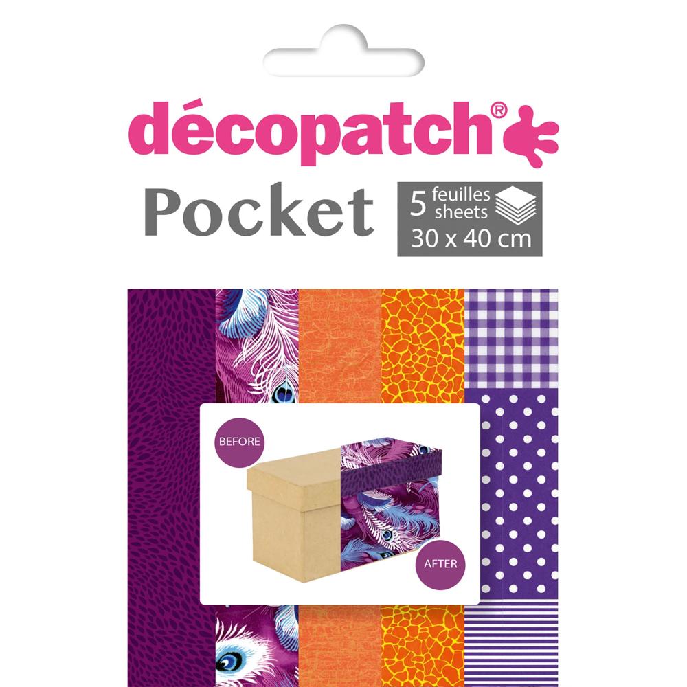 Les feuilles Décopatch vous permettront de décorer et de personnaliser de multiples supports (carton, polystyrène, bois, métal, poterie...) à l'aide du vernis colle Décopatch (non fourni). Une façon écologique de redonner vie aux vieux objets (meubles, articles chinés ou détournés de leur utilisation d'origine...). Plus de gâchis ! La mode est au reçyclage. Pour cela, rien de plus facile : déchirez ou découpez quelques morceaux de papier Décopatch d'environ 2x2 cm - Appliquez la colle sur le support que vous avez choisi. Déposez un morceau de papier sur la surface encollée et mettre une deuxième couche de colle dessus. Superposez les morceaux de papier pour recouvrir le support en mixant les couleurs et les motifs facilement grâce à cette petite pochette de 5 motifs assortis. Feuilles 30x40 cm - S'applique sur surfaces planes ou irrégulières - 5 motifs assortis.