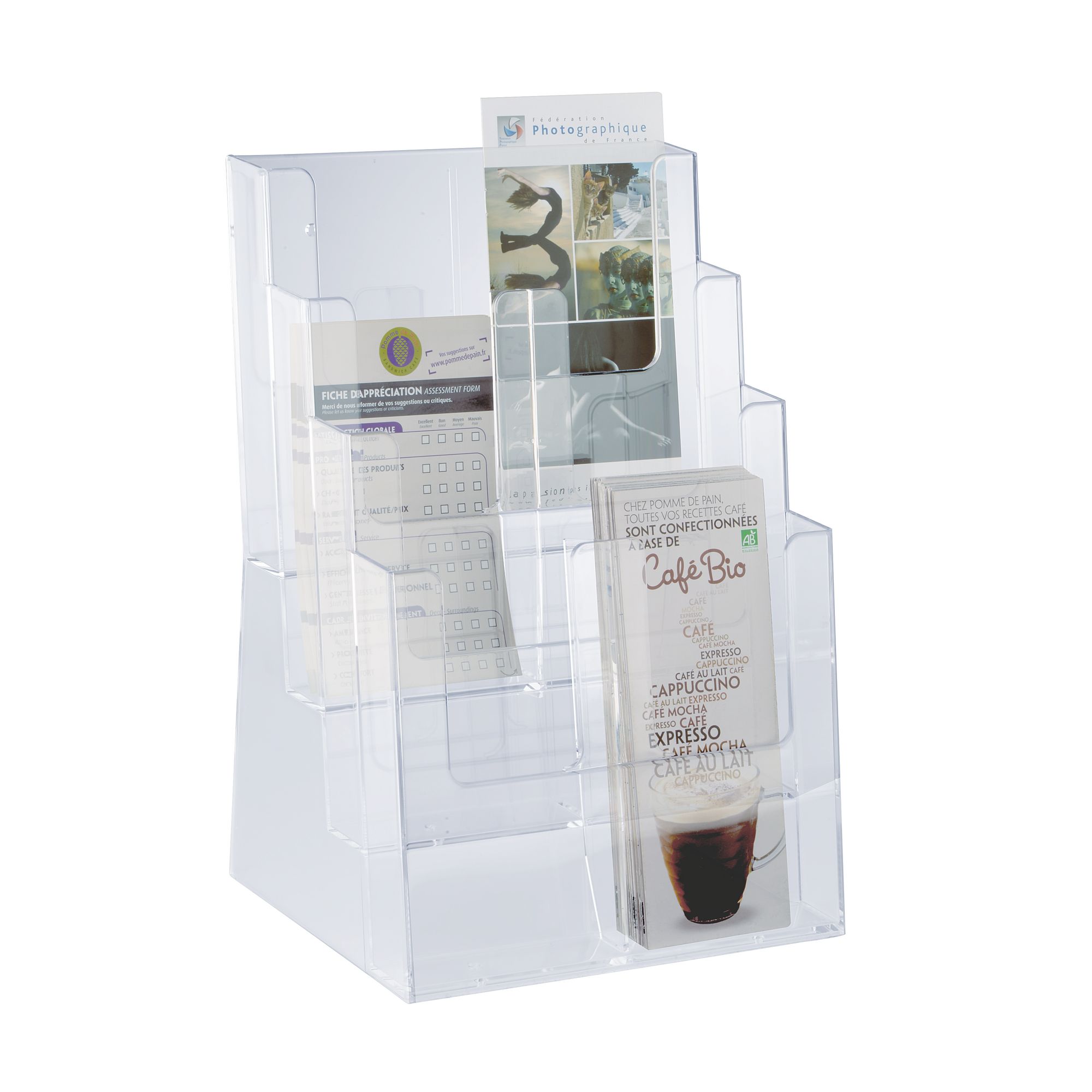 Présentation des documents en escalier. Eléments juxtaposables pour former des ensembles.Format : A4 (21 x 29,7 cm). Polystyrène cristal transparent.