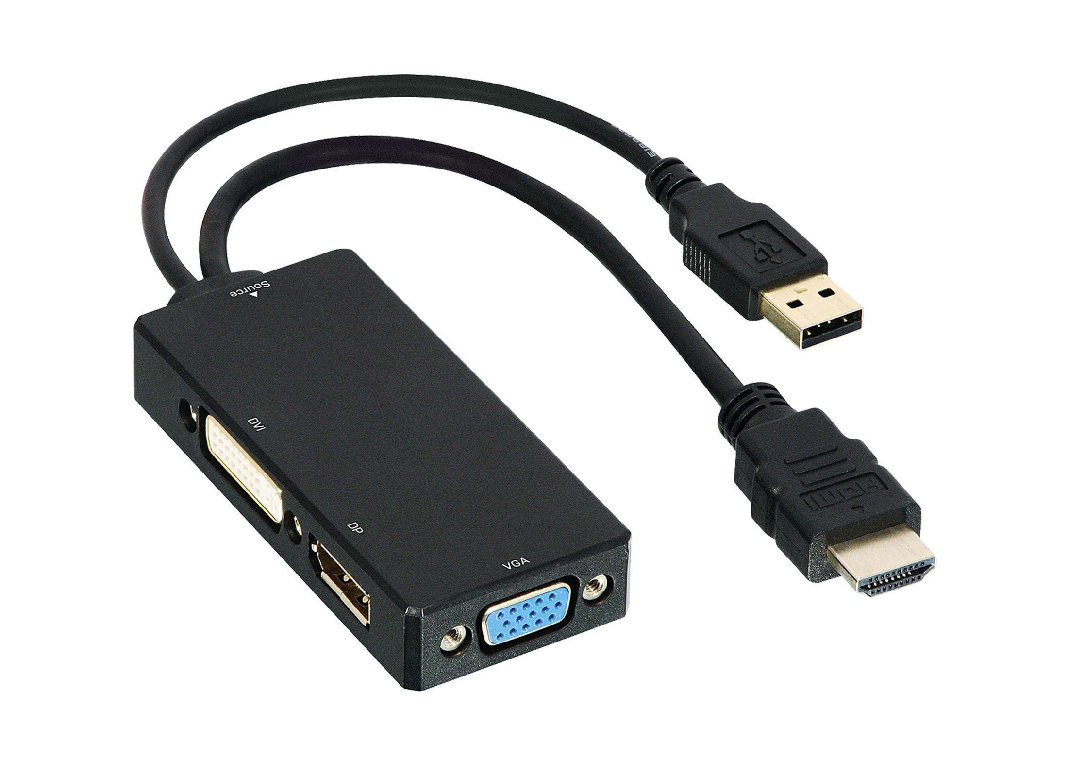 ADAPTATEUR HDMI (MALE) VERS DVI / VGA / DISPLAYPORT (FEMELLE) - Convertisseur vidéo 3-en-1 - Longueur de câble : 15cm - DVI 1080P/60Hz - VGA 1080P/60Hz - DP 4K/30Hz - Connectiques plaqué or - Raccordez une source HDMI à un écran DVI, VGA ou DP