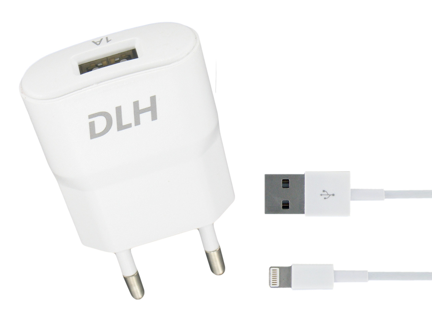 DLH Chargeur secteur USB-A 5W avec cable Apple Lightning pour iPhone. Type de chargeur: Intérieure, Type de source d'alimentation: Secteur, Compatibilité de chargeur: téléphone. Courant de sortie de l'adaptateur secteur: 1 A. Quantité de Ports USB 2.0: 1. Longueur de câble: 1 m, Couleur du produit: Blanc