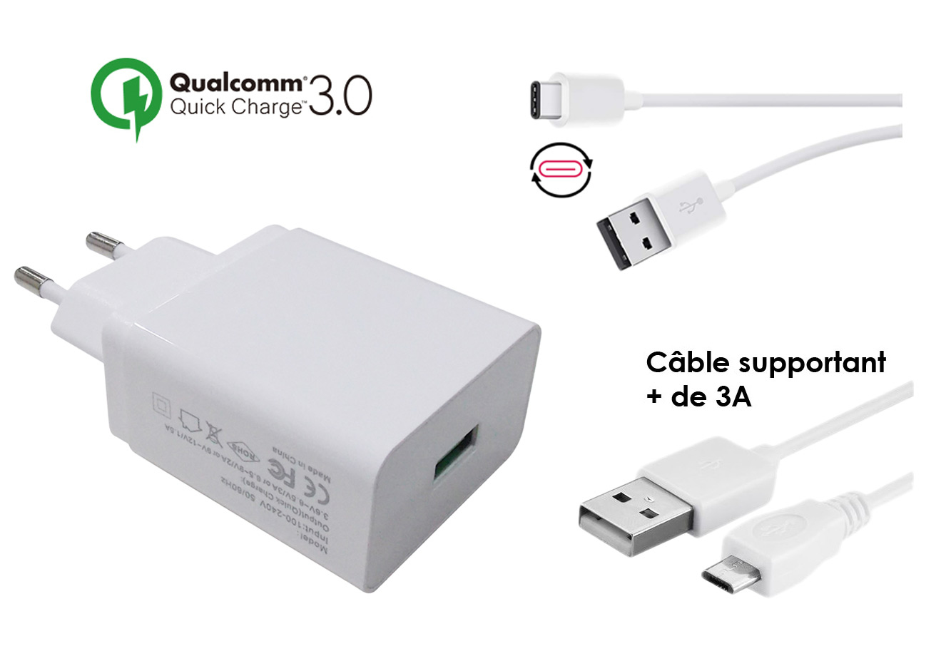 DLH Chargeur secteur USB-A Quick Charge 3.0 avec cable USB-C et cable micro USB. Type de chargeur: Intérieure, Type de source d'alimentation: Secteur, Compatibilité de chargeur: Universel. Tension d'entrée: 100 - 240 V. Quantité de Ports USB 2.0: 1, Charge rapide. Longueur de câble: 1 m, Couleur du produit: Blanc