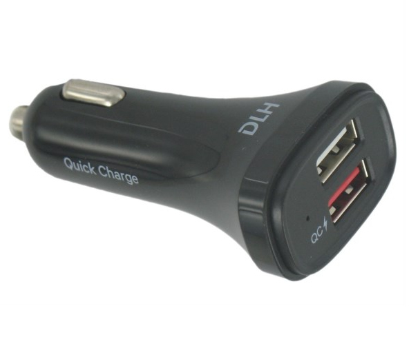 DLH Chargeur voiture USB-A Quick Charge 3.0 livre avec cable USB-C et cable micro USB. 2 ports USB dont 1 port QC Qualcomm 3.0.. Type de chargeur: Auto, Type de source d'alimentation: USB, Compatibilité de chargeur: Smartphone, Tablette. Tension d'entrée: 12/24 V, Courant de sortie de l'adaptateur secteur: 3 A. Quantité de Ports USB 2.0: 2, Charge rapide. Longueur de câble: 1 m, Couleur du produit: Noir
