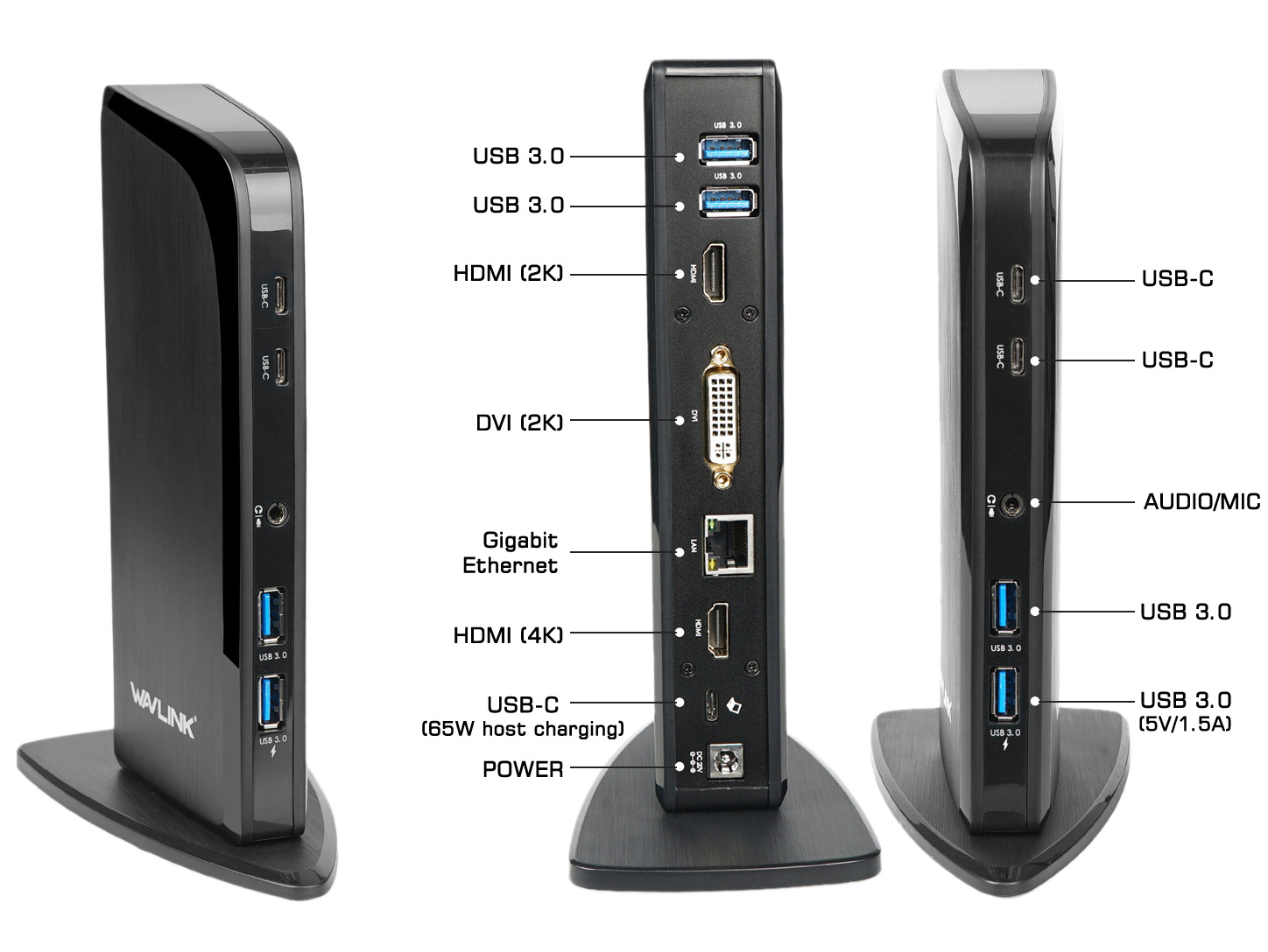 DLH Station d'accueil universelle USB-C et USB-A triple affichage avec Power Delivery 65W. Technologie de connectivité: Station d'accueil, Délivrance de la puissance USB jusqu’à: 65 W. LAN Ethernet : taux de transfert des données: 10,100,1000 Mbit/s. Couleur du produit: Noir, Compatibilité de marque: Toutes marques, Compatibilité: Toutes marques d'ordinateurs portables en USB-A ou USB-C. Alimentation d'énergie: 100 W. Câbles inclus: Secteur, USB Type-A vers USB Type-C, USB Type-C vers USB Type-C