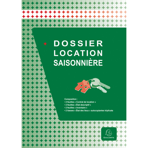 Ce dossier complet regroupe tous les documents nécessaires à une location saisonnière (non soumise à la loi du 6 juillet 1989). Contient 2 feuilles Contrat de location, 2 feuilles État descriptif, 2 feuilles Inventaire et état du mobilier et 2 liasses État des lieux autocopiantes en 3 exemplaires. Fabrication 100% française.
