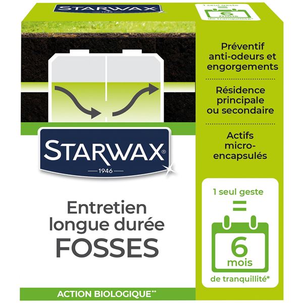 L'entretien longue durée pour fosses septiques de 500 g entretient les fosses septiques ou toutes eaux, bacs à graisses, puisards en continue grâce à sa formule biologique avec micro-capsules. Il prévient tout engorgement, évite les odeurs et permet d'espacer la corvée des vidanges. Il s'utilise quand on ne veut pas s'astreindre à un entretien hebdomadaire ou dans une résidence secondaire où les séjours sont occasionnels. 1 boîte pour une maison de 1 à 4 personnes pour six mois. Au-delà, doubler la quantité.