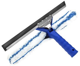 Description détailléePoignée plastique, barre métallique en acier inoxydable, barre et lèvre caoutchoutée échangeable, avec une housse microfibre amovible (lave-vitre)