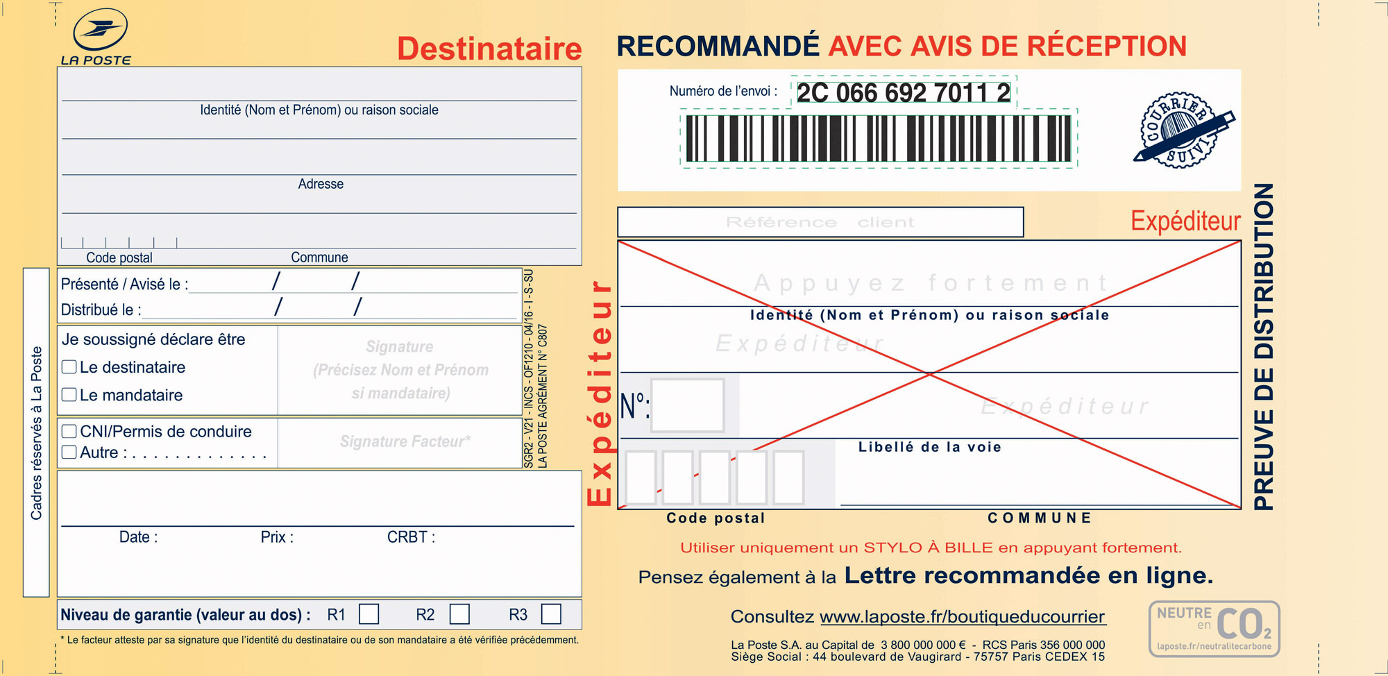 A déposer au Guichet PRO de votre bureau de Poste.