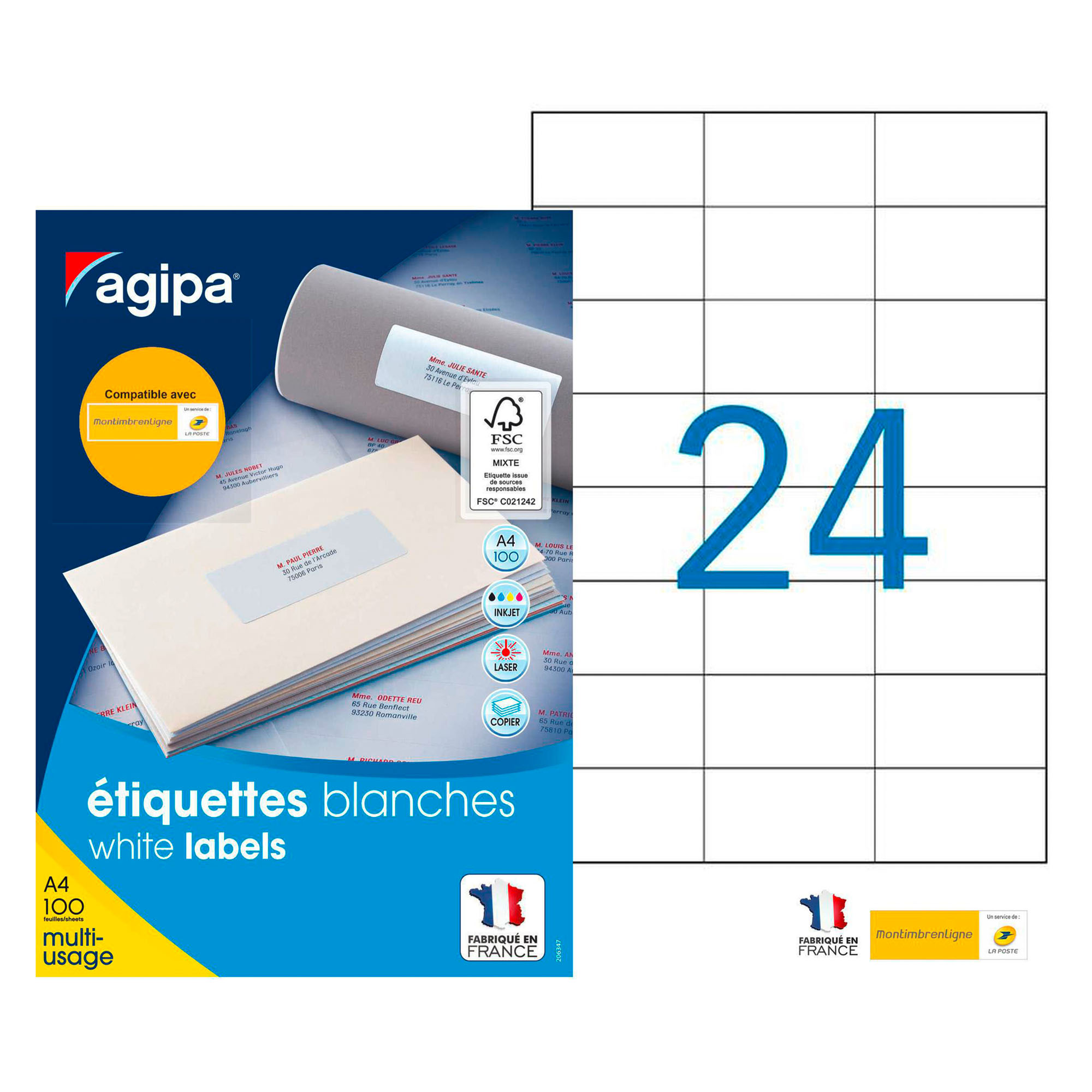 Feuilles support format A4 (21 x 29,7 cm). Dimensions : 70 x 37 mm. Boîte de 100 feuilles, 24 étiquettes par feuille, soit 2400 étiquettes au total.