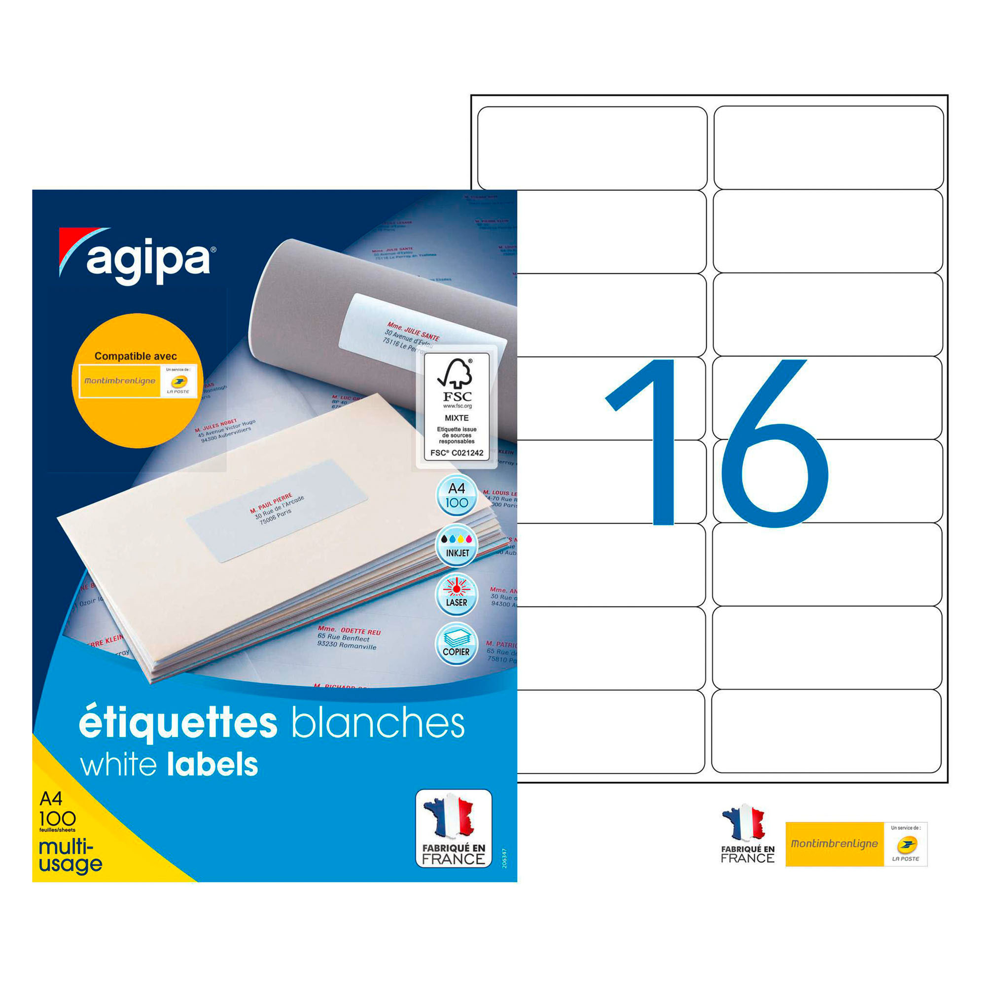 Boîte de 100 feuilles, 16 étiquettes par feuille, soit 1600 étiquettes au total.