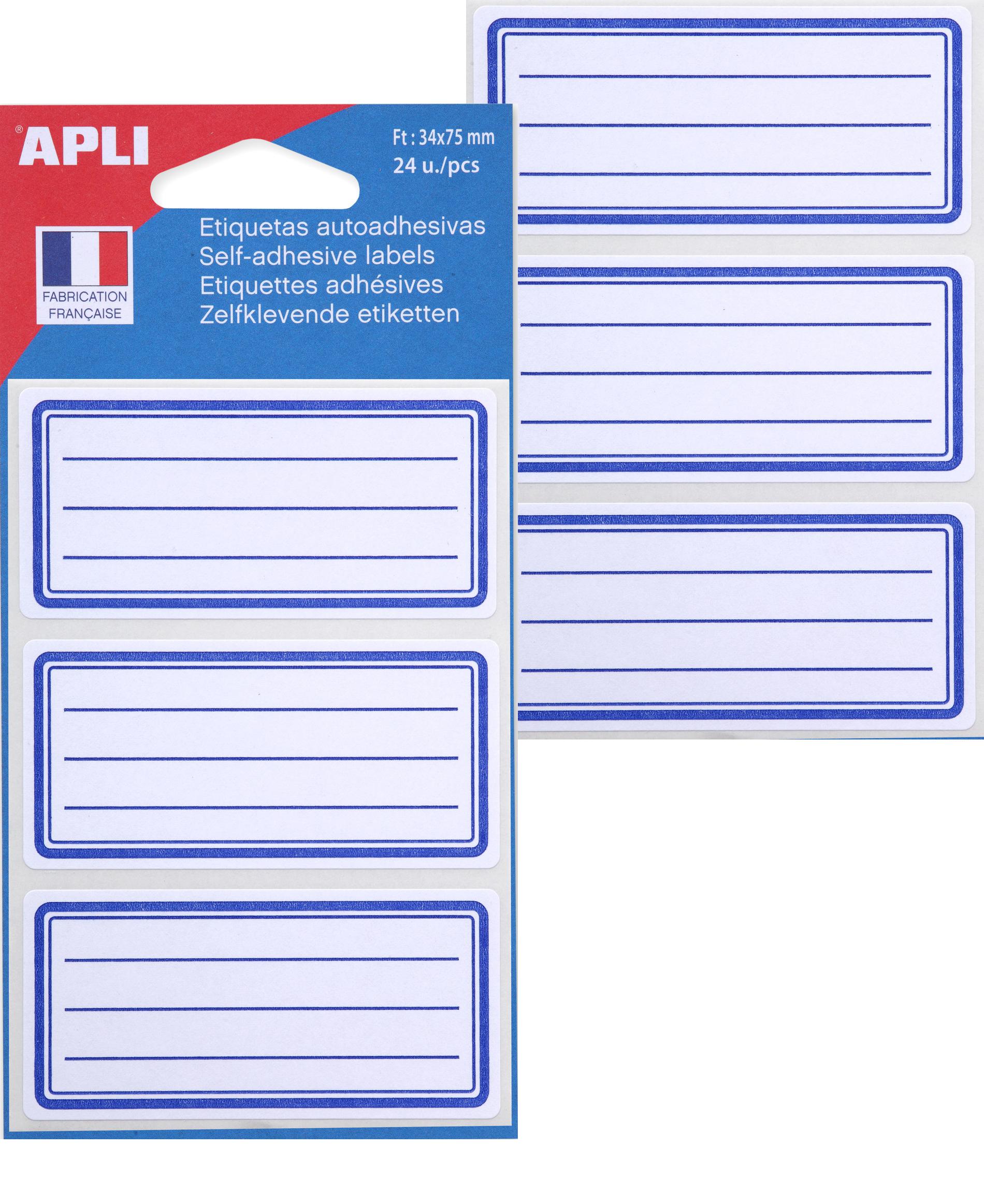 Description détailléeÉtiquettes blanches, en papier, coins arrondis, cadre bleu, 3 lignes d'écriture bleues, adhésif résistant contenu: 24 pièces sur 8 planches