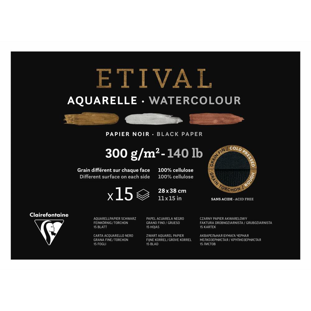 Papier aquarelle Etival 100% cellulose, de qualité étude. Sa teinte noire profonde et son double grain (fin au recto et torchon au verso) offrent de belles alternatives aux aquarellistes. Une surface subtile au recto pour une technique facilitée et une surface unique au verso. Bien adapté aux débutants ou aux utilisateurs occasionnels. Sans acide, de pH neutre excellente conservation et bonne capacité d'absorption.
