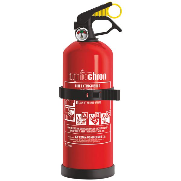 L'extincteur poudre ABC 1 Kg avec manomètre de chez Ogniochro est équipé d'un manomètre indiquant la bonne pression en bar de l’extincteur. Design ergonomique pour une utilisation facile avec dégoupillage rapide. A = feux de solides : bois, papiers, cartons, plastiques, chiffons. B = feux de liquides : essence, huile, fioul, graisses, alcools. C = feux de gaz : butane, propane, méthane, acétylène. C'est un extincteur pressurisé à poudre avec manomètre conçu spécialement pour l'automobile, la marine de plaisance et pour l'utilisation domestique. Températures d'utilisation de -30°C à + 60°C, par conséquent adéquat aussi dans les pays à températures extrêmes. Capacité 1 Kg. Bouteille en alliage d’aluminium recouvert d'une résine polyester résistante aux UV.