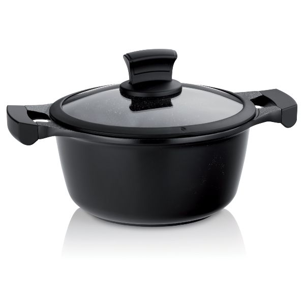 Faitout 20 cm - Stella Nova - Une gamme d'ustensiles de cuisson au design attrayant permettant une cuisine saine et croustillante - En fonte d'aluminium avec revêtement anti-adhésif renforcé 3 couches résistant aux rayures et qui permet de cuire avec une petite quantité de matière grasse - Répartition homogène des matières grasses grâce au Oil Control System : la texture non lisse du revêtement permet de griller les aliments en utilisant très peu de matière grasse - Les aliments ne brûlent pas et ne collent pas - Fond épais en inox permettant de faire des économies d'énergie tout en répartissant uniformément la chaleur - Poignée en bakélite stable et ergonomique avec revêtement Soft Touch - Couvercle en verre - Diamètre 20 cm - Hauteur 10.5 cm - Contenance 2.2 L - Coloris Noir - Tous feux dont induction - Garantie 5 ans.