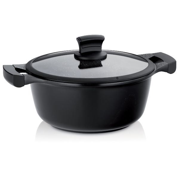 Faitout 24 cm - Stella Nova - Une gamme d'ustensiles de cuisson au design attrayant permettant une cuisine saine et croustillante - En fonte d'aluminium avec revêtement anti-adhésif renforcé 3 couches résistant aux rayures et qui permet de cuire avec une petite quantité de matière grasse - Répartition homogène des matières grasses grâce au Oil Control System : la texture non lisse du revêtement permet de griller les aliments en utilisant très peu de matière grasse - Les aliments ne brûlent pas et ne collent pas - Fond épais en inox permettant de faire des économies d'énergie tout en répartissant uniformément la chaleur - Poignée en bakélite stable et ergonomique avec revêtement Soft Touch - Couvercle en verre - Diamètre 24 cm - Hauteur 10.5 cm - Contenance 3.5 L - Coloris Noir - Tous feux dont induction - Garantie 5 ans.