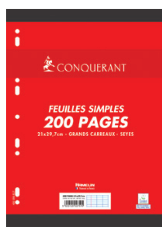 PROTECTION : Les feuilles sont conditionnées sous un film protecteur pour éviter qu'elles ne s'abîment. REGLURE : La réglure à grands Carreaux Seyès, en 2 couleurs assure une meilleure lisibilité. Elle permet de réduire l'effet de la fatigue visuelle, tout en améliorant efficacement la concentration. PERFORATIONS : Les feuilles sont perforées à 2 trous, ce qui permet de les ranger rapidement et facilement dans un classeur compatible. FORMAT : Les feuilles sont de petit format scolaire 17x22cm, très léger et pratique. Il s'adapte aux classeurs de même format qui sont faciles à ranger dans un sac ou un cartable, sans le surcharger. LABEL : Les feuilles Conquérant sont certifiées Ecolabel EU. Ce label garantit un faible impact environnemental lors de la fabrication du papier pour un respect de l'environnement. FABRIQUE EN FRANCE : Les produits Conquérant sont tous fabriqués en France, dans nos usines situées à Caen, en Normandie et ils garantissent le savoir-faire français, pour des modèles de qualité et résistants.