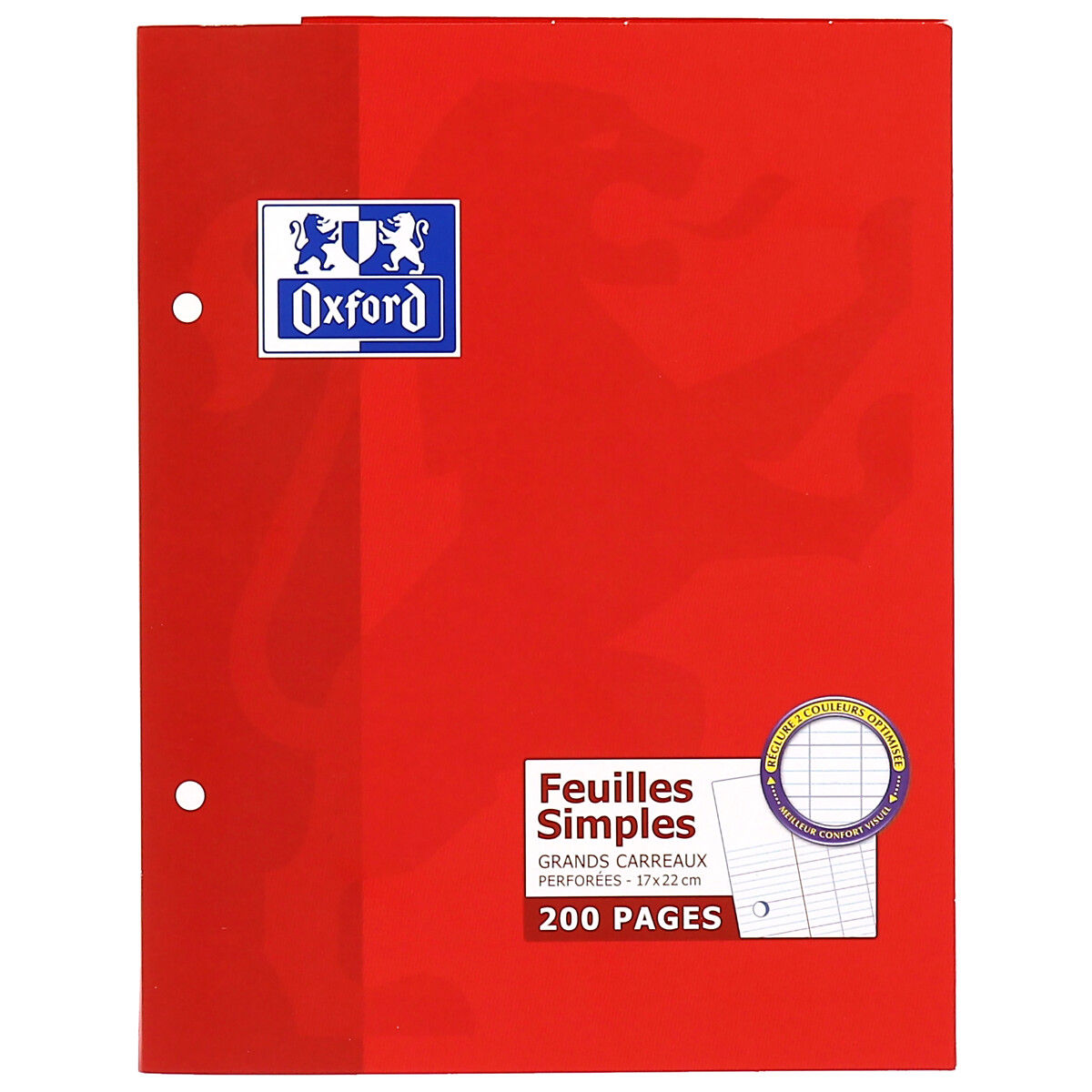PROTECTION : Les feuilles simples sont rangées dans un étui en carte vernie, de couleur orange. Il protège les feuilles et résiste aux imprévus. PERFORATION : Les feuilles sont perforées à 2 trous. Elles se rangement rapidement et facilement dans un classeur. REGLURE : La réglure à grands Carreaux Seyès, en 2 couleurs assure une meilleure lisibilité. Elle permet de réduire l'effet de la fatigue visuelle, tout en améliorant efficacement la concentration. Ce produit est disponible sous les versions de couleurs suivantes : Rouge